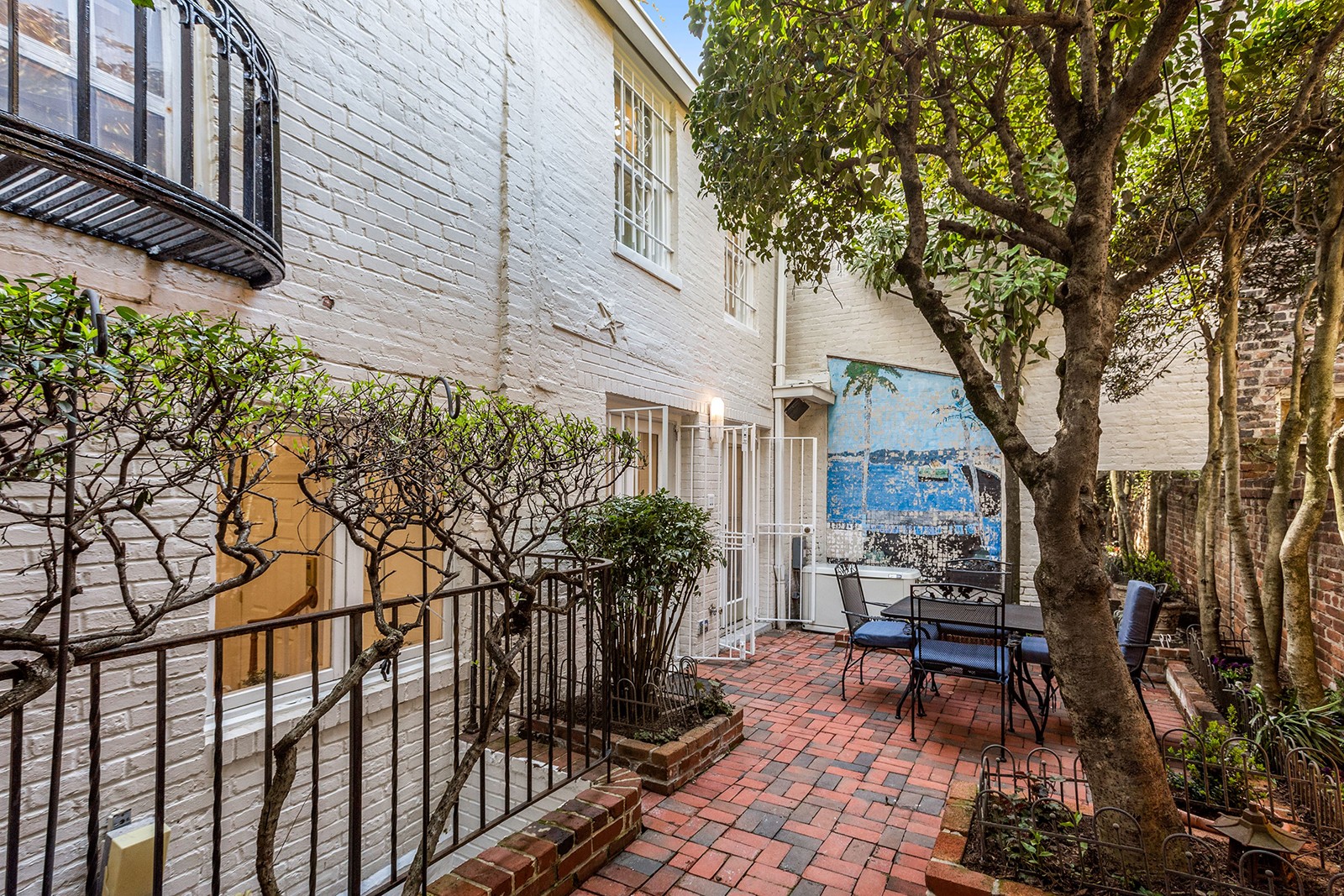 Two homes combined, this quintessential Georgetown home maintains its original character with touches of modern convenience. The back of the house features glass galore, with double french doors that open to a walled garden oasis. Large enough to host gatherings, but with separate spaces conducive to more intimate conversations, this terrace offers residents and guests a tasteful place to relax and take in the outdoors. The extensive brick hardscaping is shaded by mature specimen trees and a private gated alleyway.