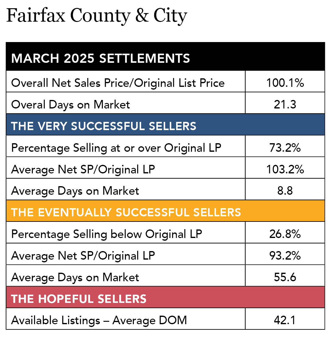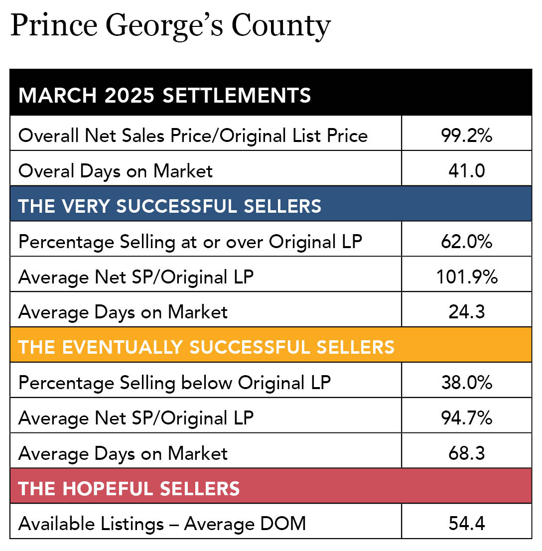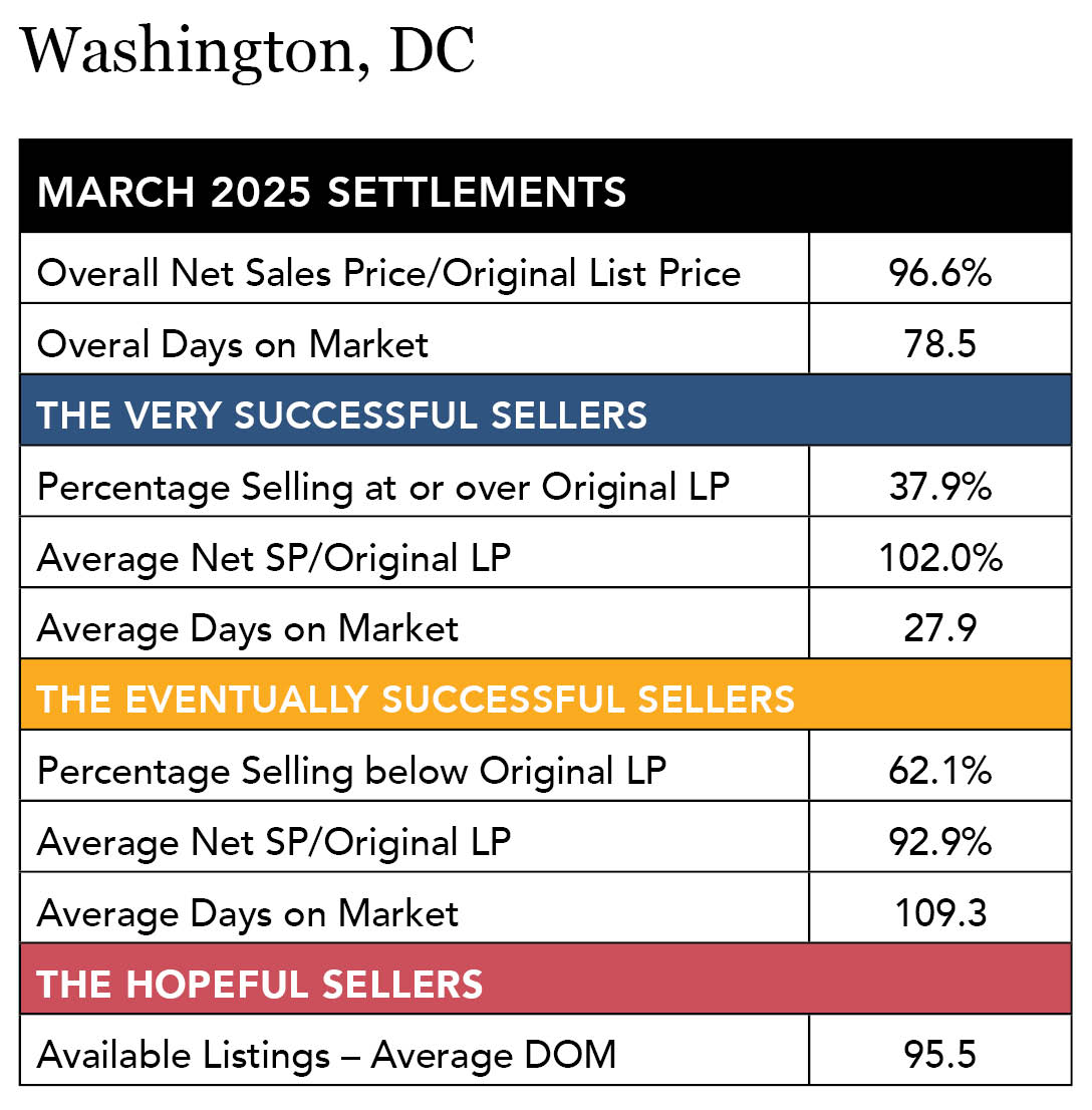 Inventory is also influencing the statistical story. In every jurisdiction, the number of homes on the market at the end of March 2025 was up considerably from March of last year. An example: Northern Virginia inventory is 69% higher than it was this time last year. But, again, it’s a matter of context. Despite the big percentage increases, inventory in most areas is still well below the “normal” levels we saw pre-COVID. Overall supply in most of the suburban markets is still less than 1.5 months. DC stands at 4 months.