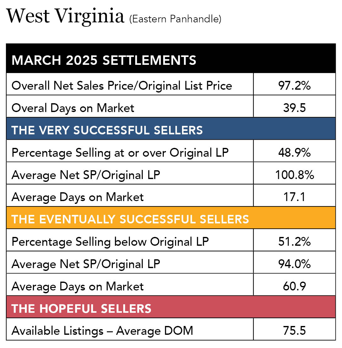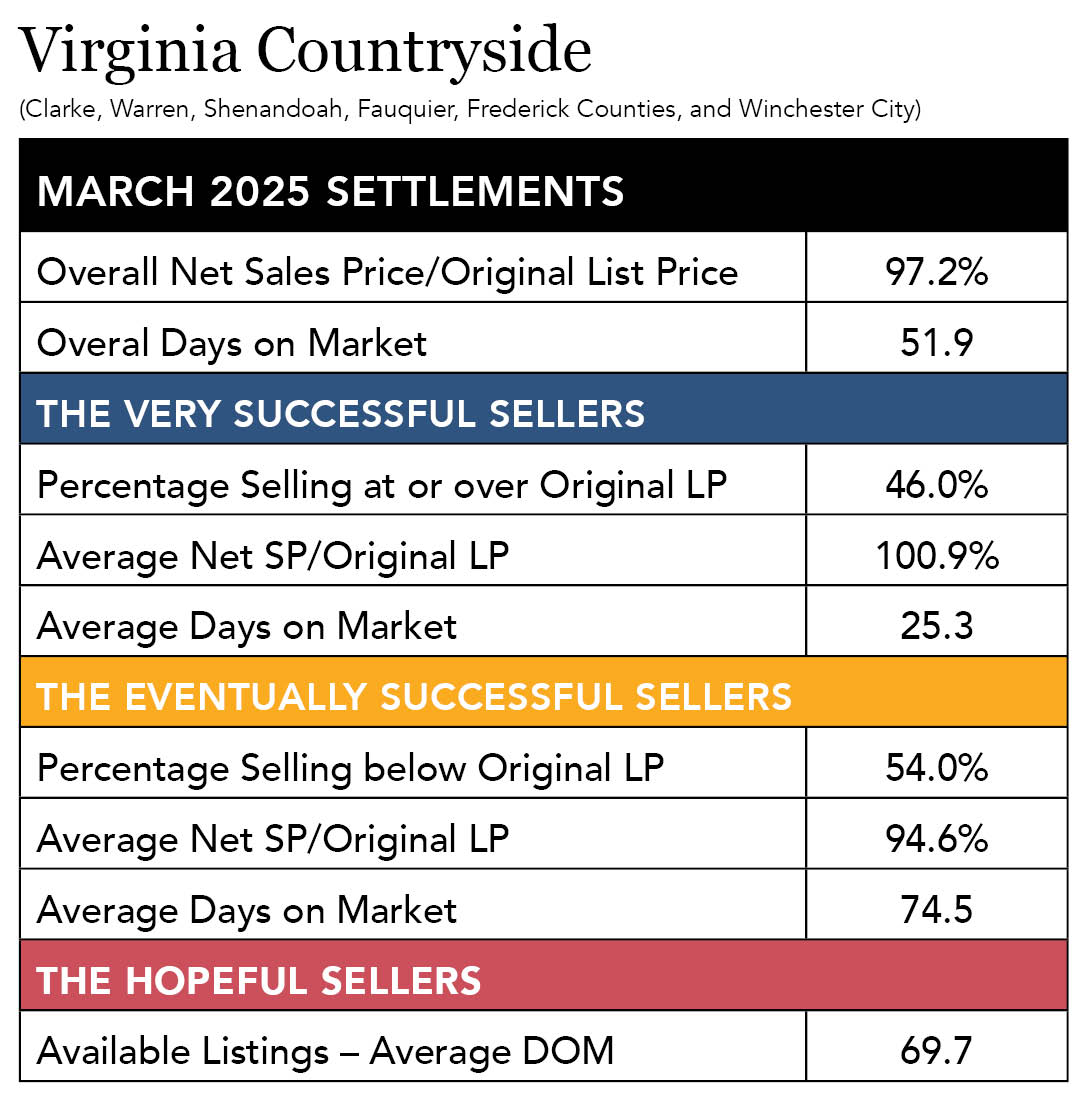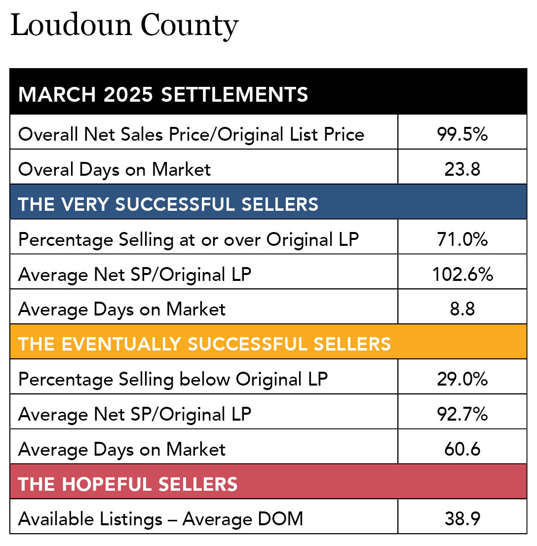 Inventory is also influencing the statistical story. In every jurisdiction, the number of homes on the market at the end of March 2025 was up considerably from March of last year. An example: Northern Virginia inventory is 69% higher than it was this time last year. But, again, it’s a matter of context. Despite the big percentage increases, inventory in most areas is still well below the “normal” levels we saw pre-COVID. Overall supply in most of the suburban markets is still less than 1.5 months. DC stands at 4 months.